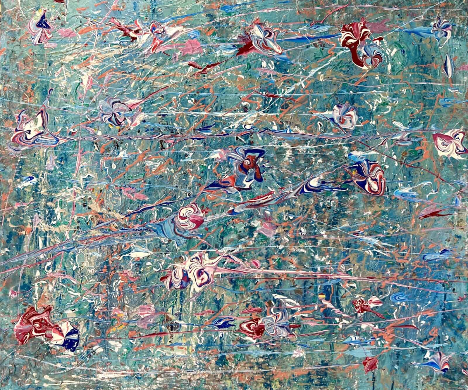 In “Aquarius,” flowing layers of turquoise, coral, and soft lavender merge like shifting water currents. The rhythmic, fluid composition invites you to dive into a tranquil, dream-like world where movement and stillness coexist. Accents of deep blue and white shimmer across the surface, evoking reflections of light dancing on the sea. A painting that feels both meditative and alive.