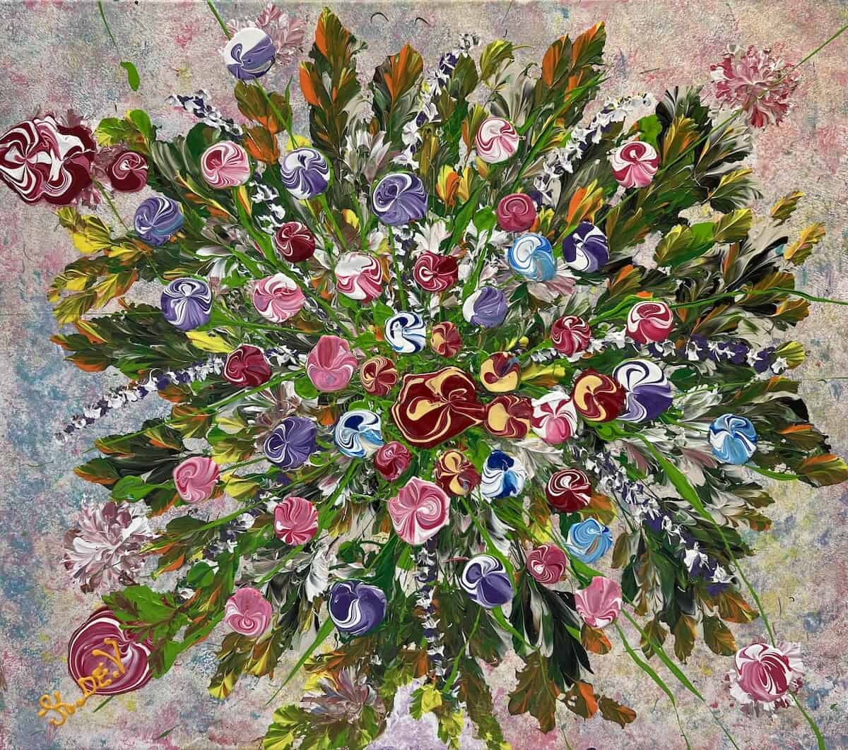 Ariane is expansive and radiant. The composition feels almost panoramic, with floral elements blooming outward in a rich, colorful burst. Warm and cool tones intertwine seamlessly, while the textured background adds softness and depth. This painting carries a strong sense of freedom and movement, making it a striking focal point within any space.