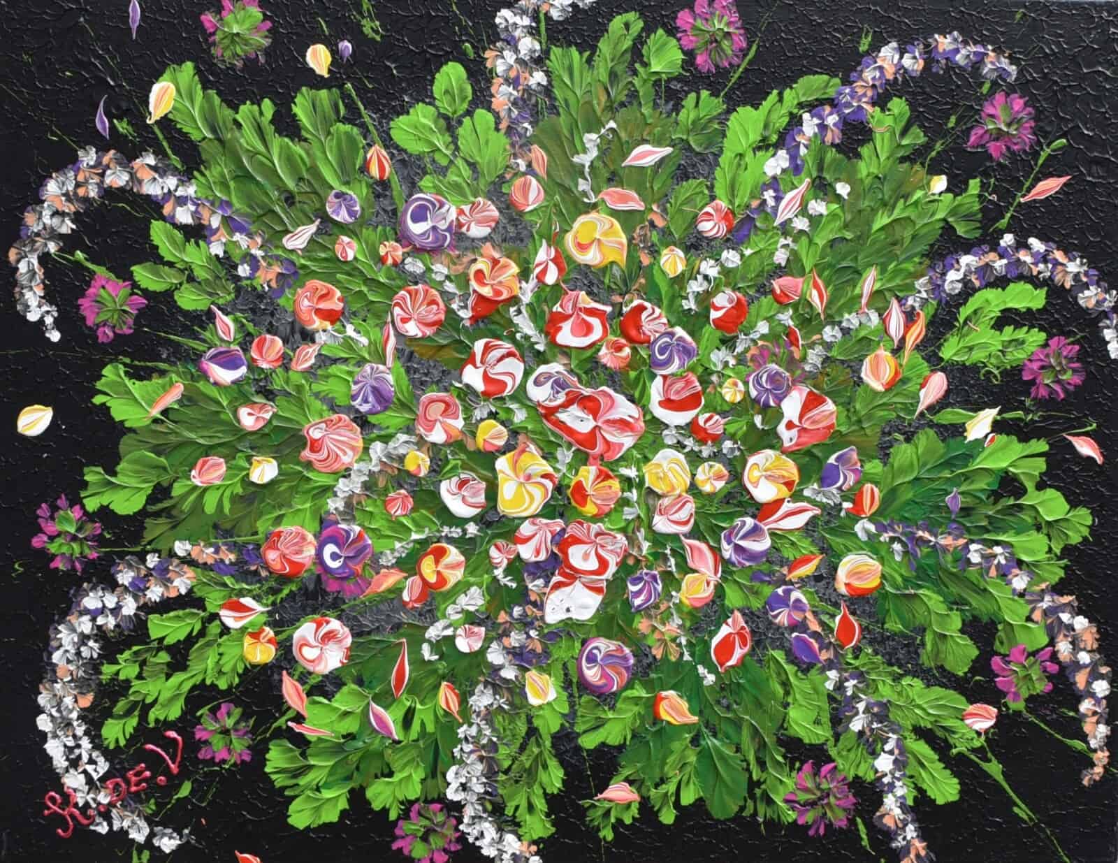 Belinda bursts with life against a deep black backdrop, where vibrant red, purple, yellow, and orange blossoms fan out in a radiant composition. The swirling flowers and cascading stems give the impression of motion and abundance, like a bouquet exploding with joy.