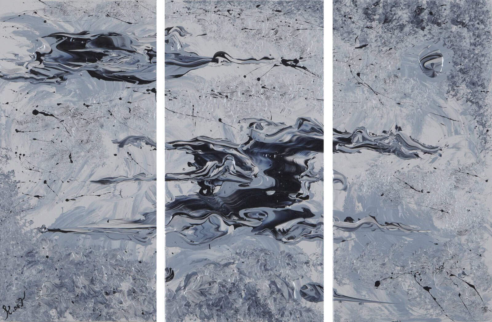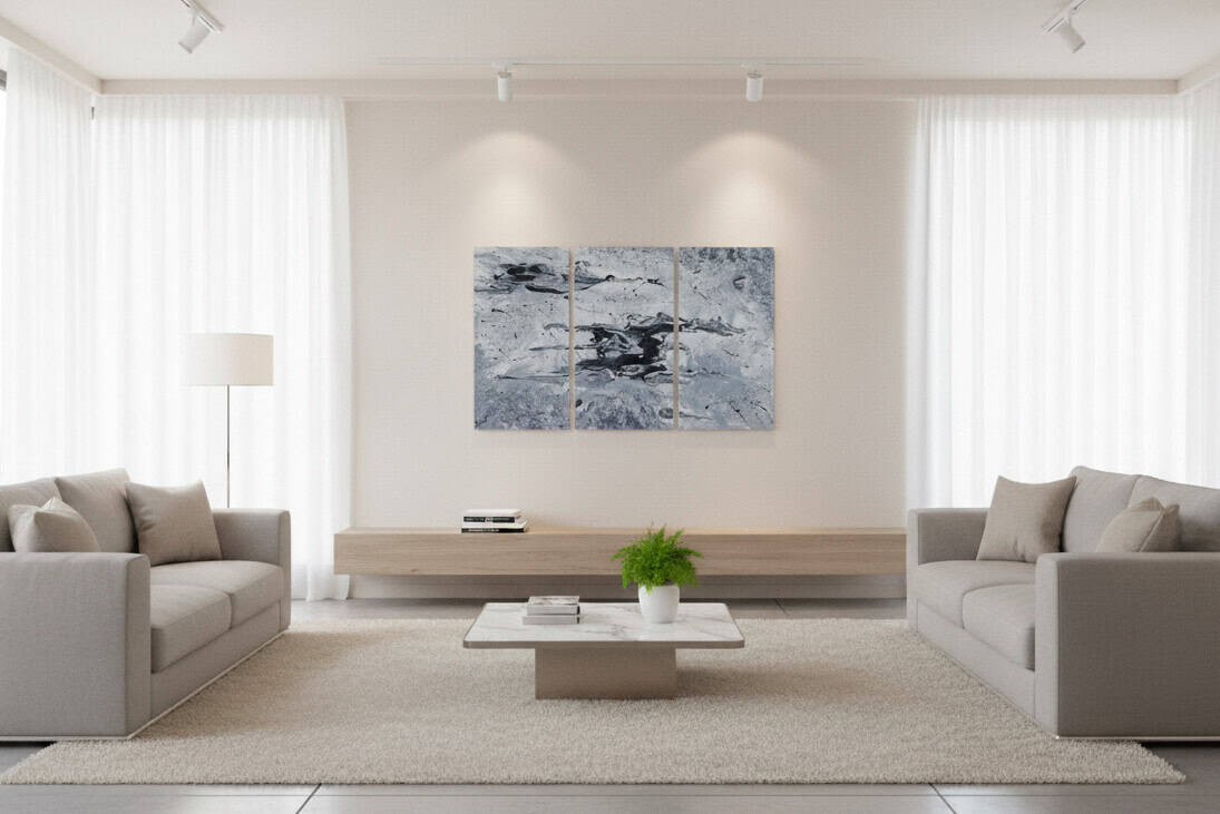 Black Swan is a triptych that flows across three panels in shades of black, grey, and white. Fluid forms and sweeping textures move like waves, creating both contrast and harmony. The painting has a refined, almost monochrome elegance, with subtle depth that invites the eye to linger on its details.