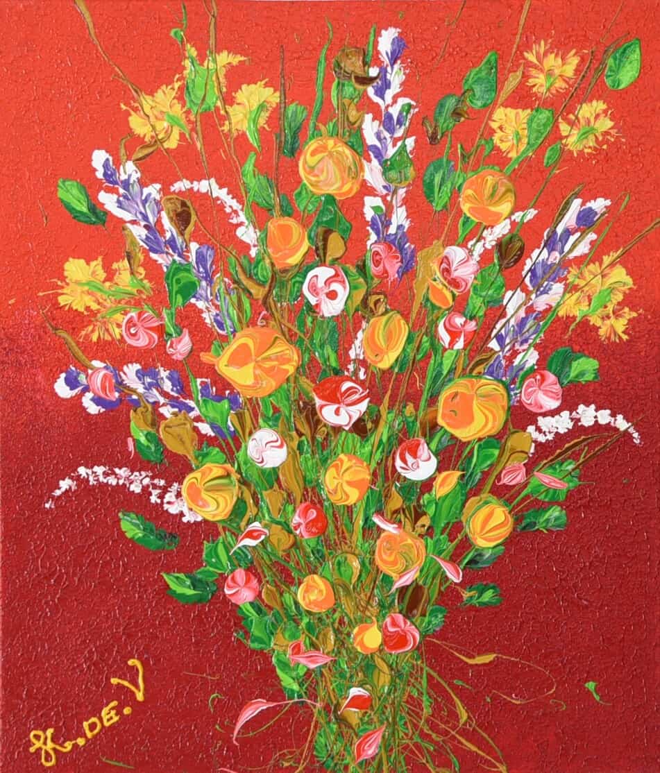 With its rich red background, Bo is a bold and expressive bouquet. Orange, yellow, and red blossoms rise in playful clusters, framed by lively green stems and soft lavender accents. It’s a painting that feels fiery and celebratory, yet still harmonious.
