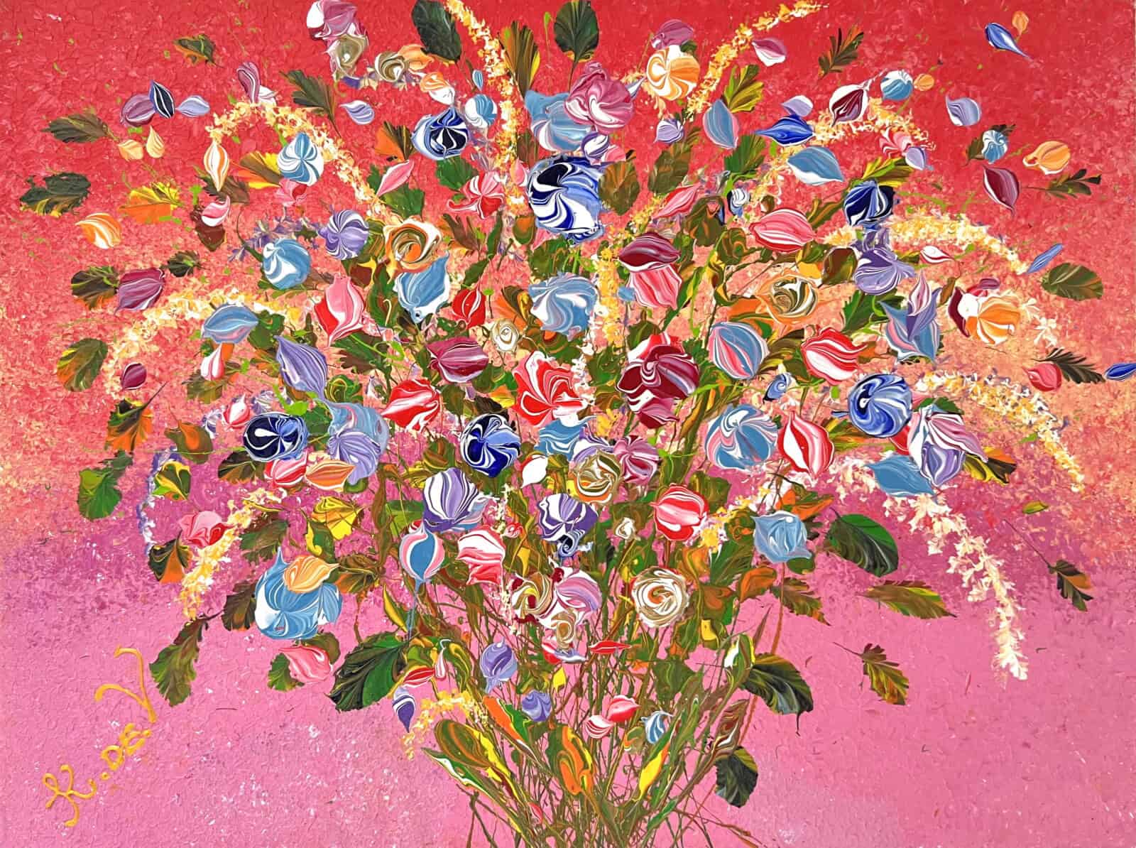 Camelia is a joyful celebration of color, with its blossoms set against a radiant pink backdrop that shifts into coral tones. Blue, red, purple, and yellow flowers burst forward, blending delicacy with boldness. A lively bouquet that brings brightness and cheer to any space.