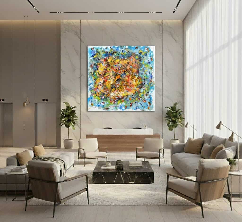 Cosmos is an expansive, galaxy-inspired work that draws the viewer into a world of color. Dynamic swirls of blue, yellow, and red burst outward from the center, layered over a deep, textured ground. The painting feels infinite and radiant, capturing the mystery, motion, and brilliance of the universe.