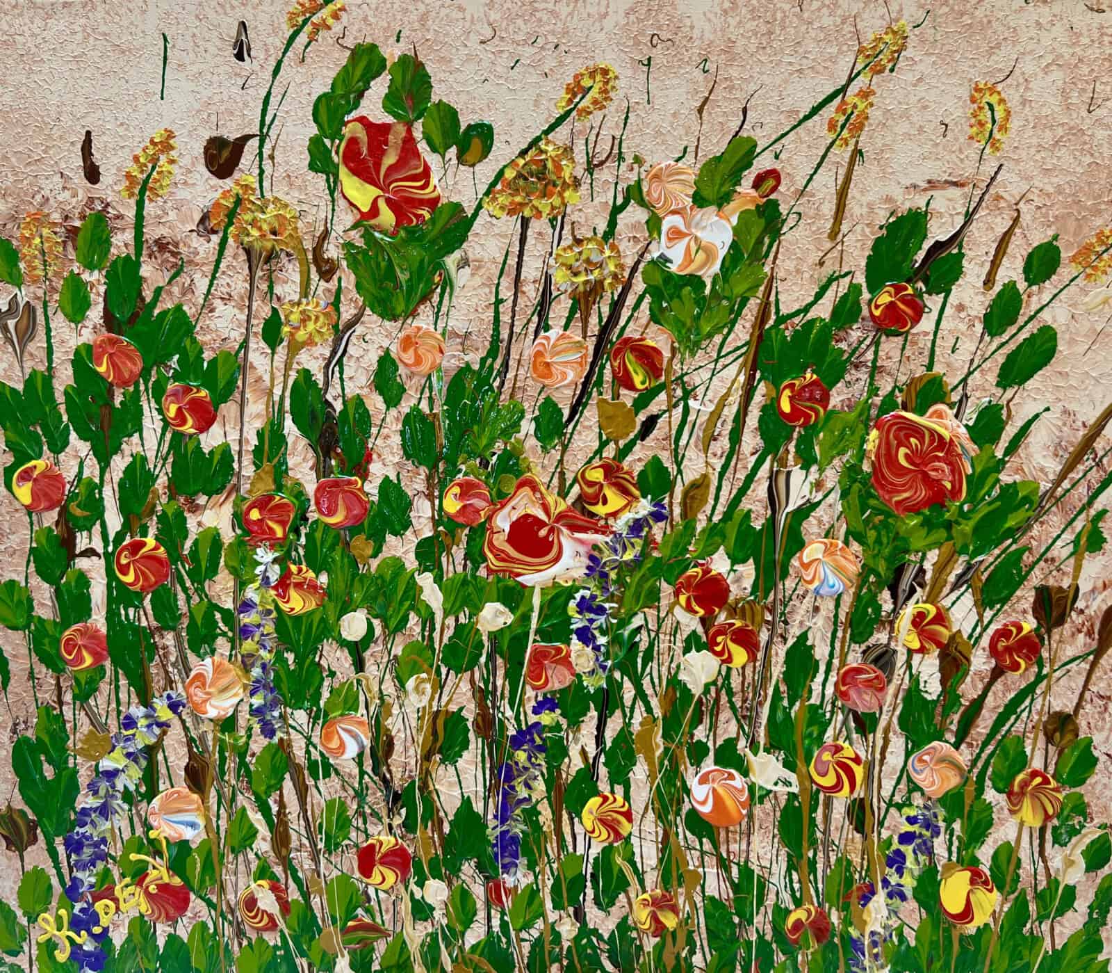Dorine is an intimate yet striking piece, where warm reds, oranges, and yellows bloom against a soft textured background. Deep green stems and splashes of violet weave through the composition, adding contrast and harmony. Compact in size but rich in presence, it feels like a field brought to life on canvas.