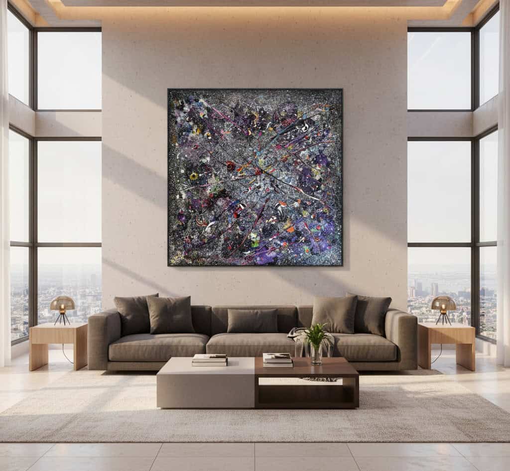 Abstract universe painting called Intergalactic (on the wall) by Keren de Vreede