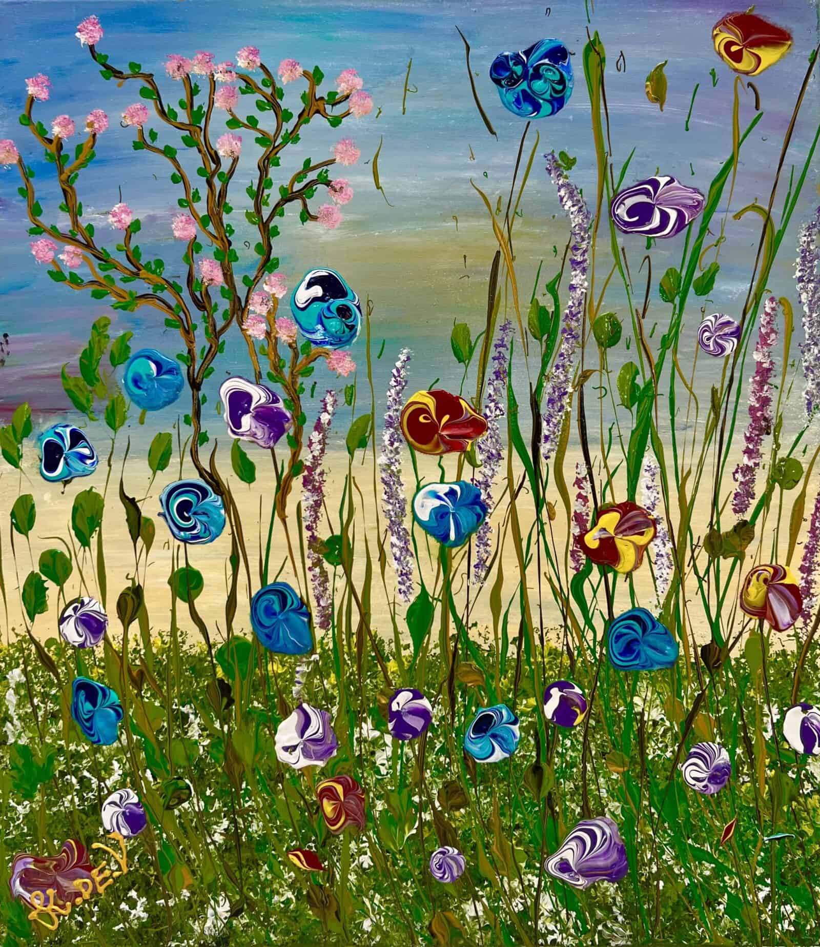 Kate evokes a sunlit field under a soft, glowing sky. Bright greens and vivid floral forms create a lively foreground, while the gentle gradient of the sky adds warmth and depth. The painting balances energy and serenity, capturing a fleeting moment of nature in bloom.