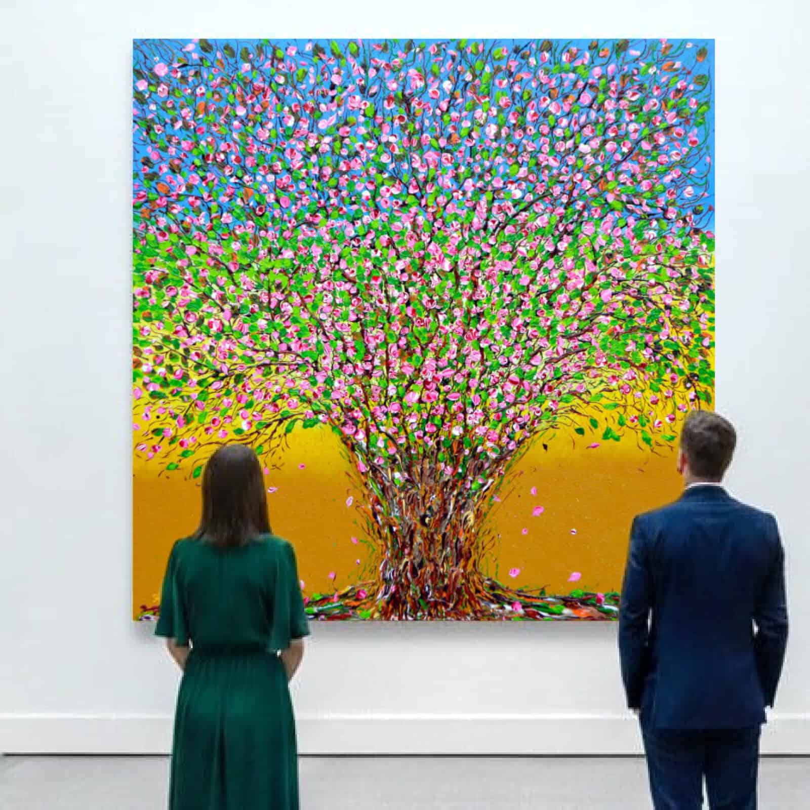 A monumental, one-of-a-kind creation that embodies her artistic vision at its fullest. This radiant work celebrates themes of renewal, love, vitality, and connection. A flourishing tree crowned with hundreds of delicate pink blossoms stretches across the canvas, set against a glowing golden background and expansive blue sky. Petals drift softly through the air, branches reach outward with quiet strength, and the textured trunk anchors the composition with depth and presence.