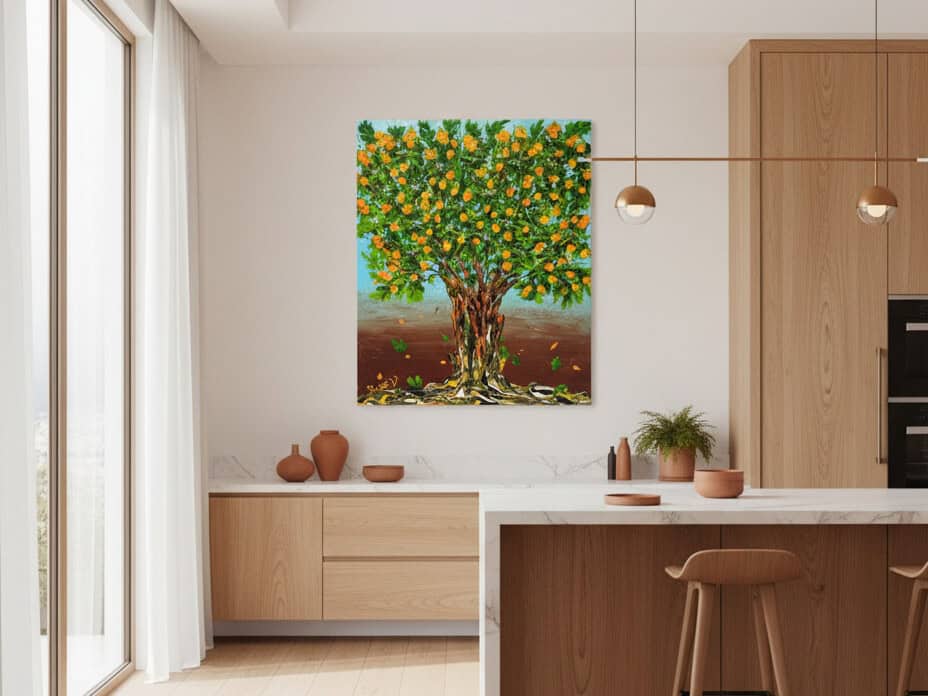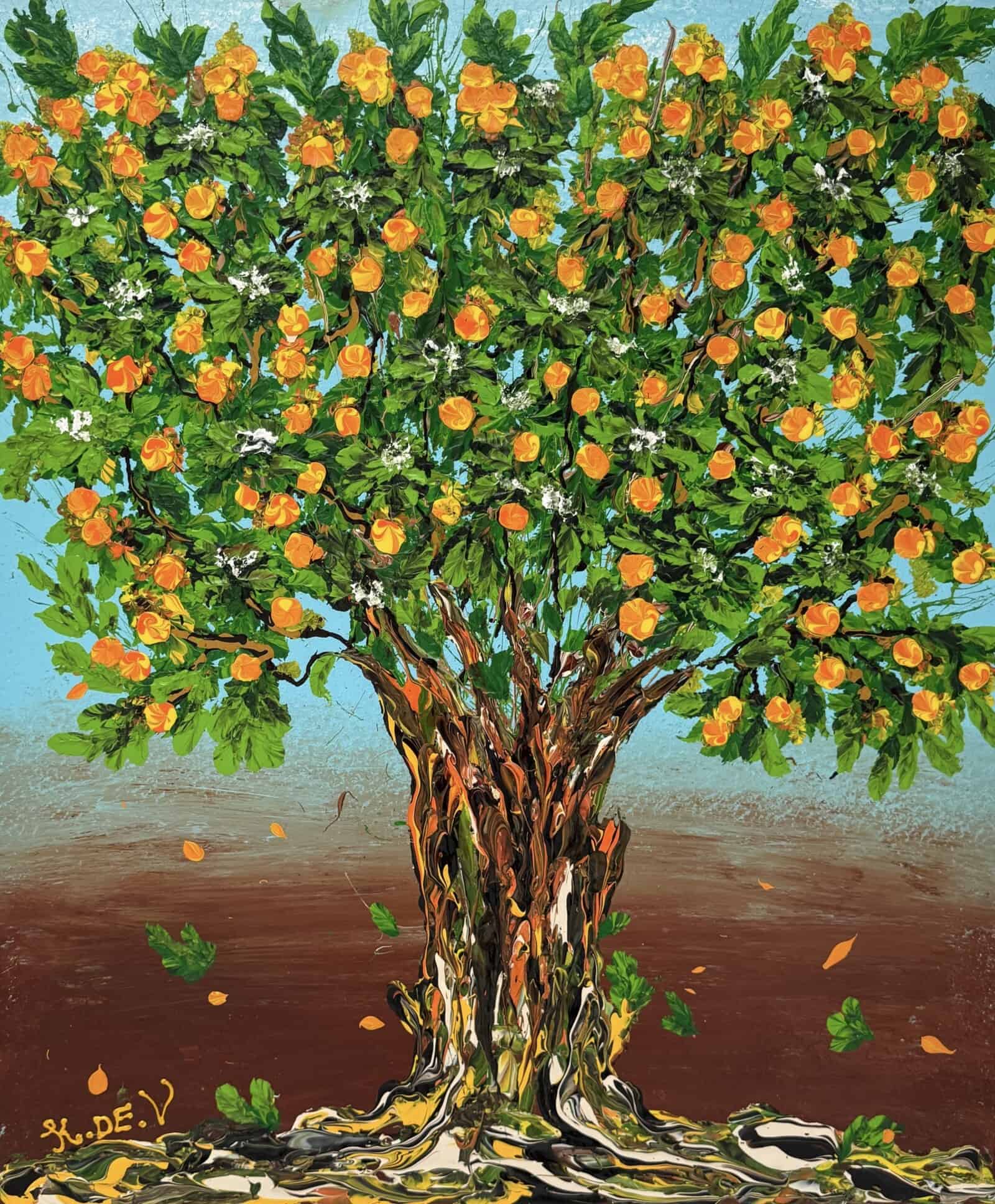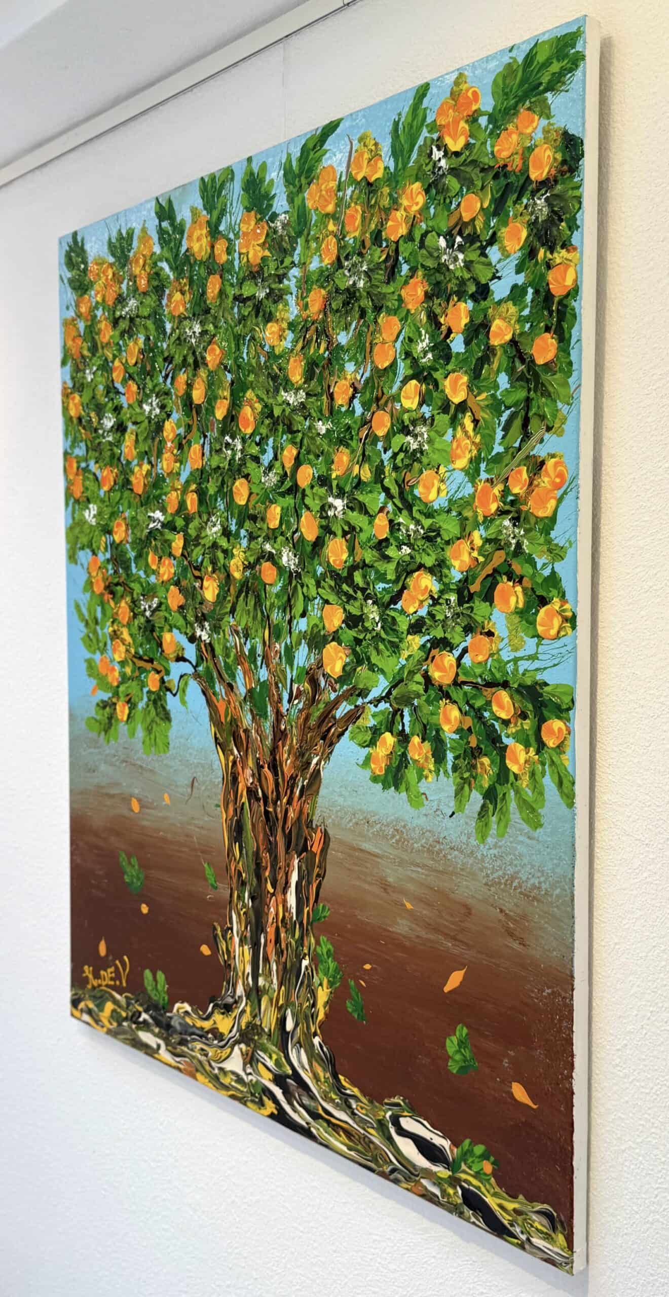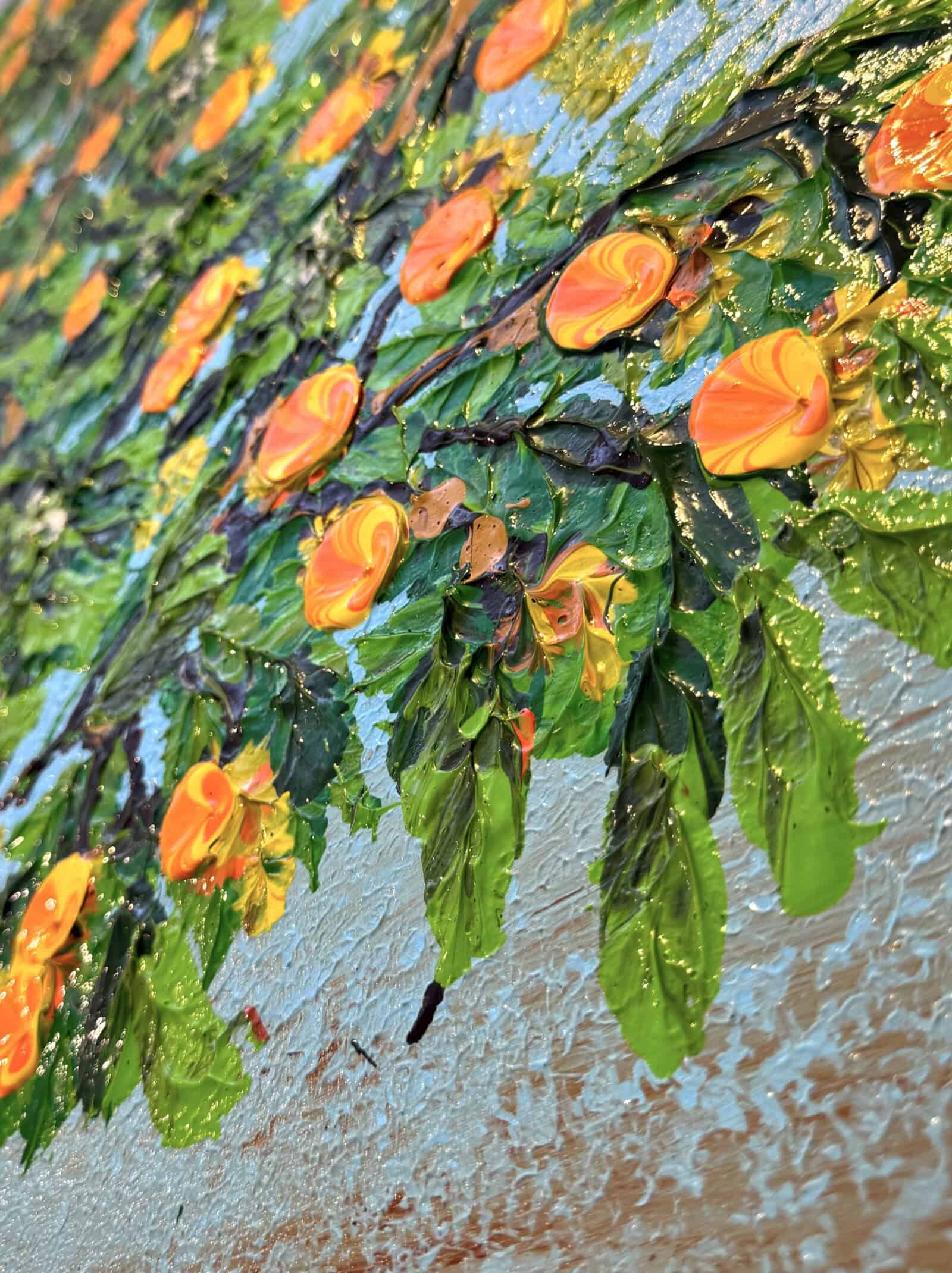 A tree filled with glowing orange blossoms rises against a backdrop that shifts from soft blue to earthy brown. The textured golden trunk gives the work strength and grounding, while the fresh green leaves and drifting petals add movement. The painting radiates warmth and energy, echoing the sunny spirit of the Mediterranean.